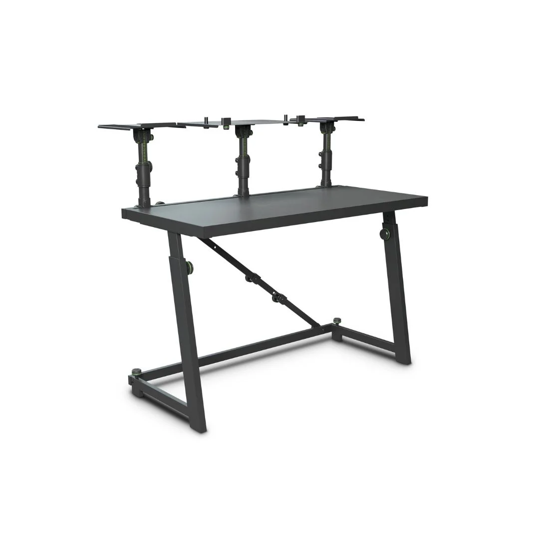 The Gravity® DJ Desk offers an expandable design with optional accessories, allowing users to customize their workspace. With add-ons like a laptop holder or studio monitor holders, extra space can be created for equipment. The rear rail enhances flexibility, ensuring the desk meets the unique needs of DJs, producers, and instrumentalists.
