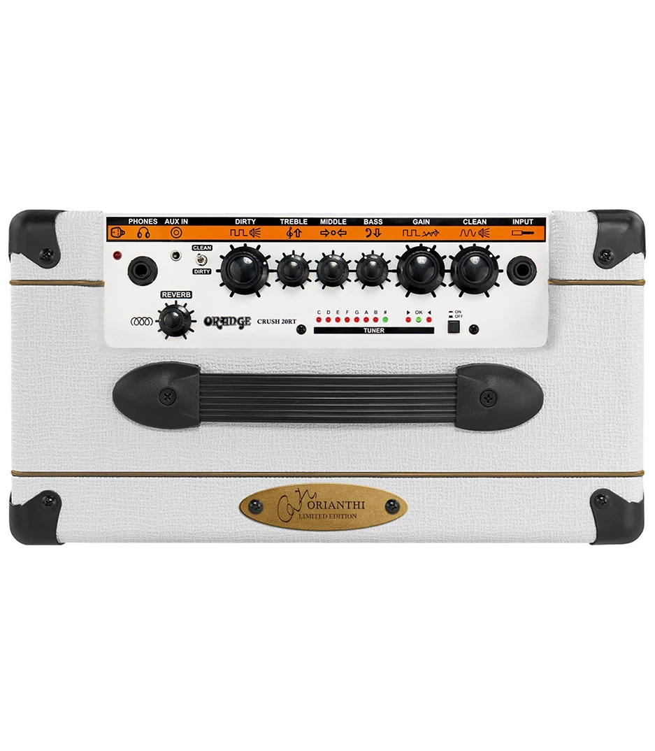 The Orange Crush 20RT Orianthi Signature is a 20-watt solid-state guitar combo amp featuring a single 8″ speaker and twin-channel design. Equipped with CabSim headphone output, digital reverb, and a built-in tuner, it delivers versatile tones for practice, recording, or small gigs. Perfect for guitarists seeking compact, professional sound with iconic Orange tone.